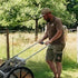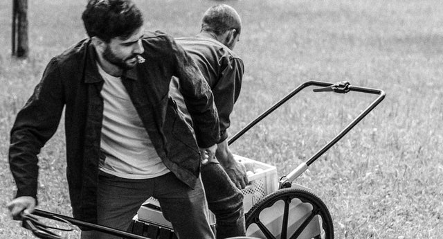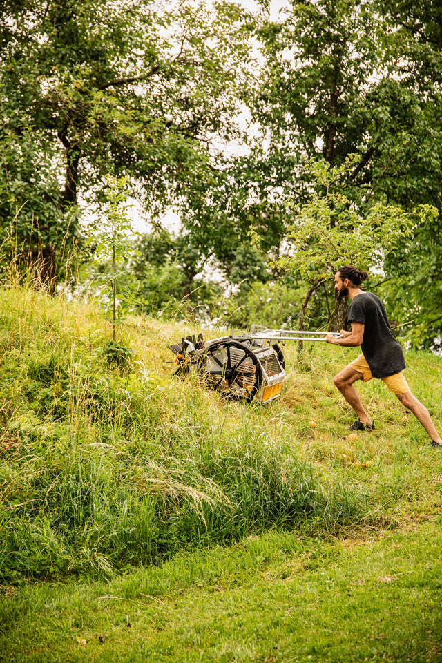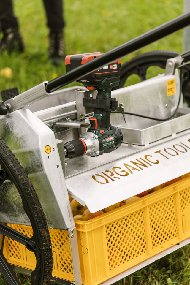 Obstraupe is not self-propelled. It is hand-propelled. While the collection roller's rotation provides some supportive drive, the wheels themselves are not powered. This lightweight design allows you to transport it easily, and enhances its agility in the orchard, especially on slopes. Its single-axle design and large 24" wheels make it feel like an off-road sports machine.
