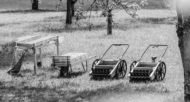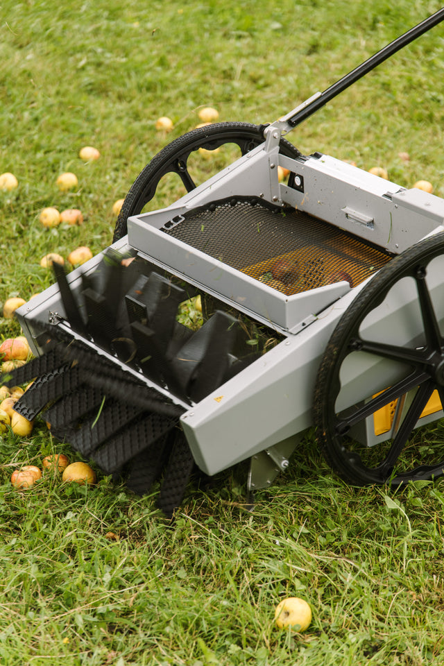 Obstraupe removes 90% of leaves, grass and debris thanks to its internal leaf brush. For areas with significant amounts of rotten fruit (e.g. in the summer, first harvest), we recommend using the OBSTRAUPE to clear the ground first. For high quality sorting, consider OBSTRAUPE's companion Sorter 2 Sorting Table.