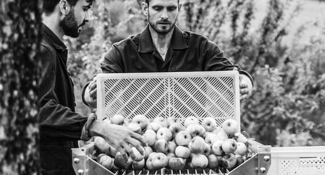 Obstraupe and Sorter work best with "Euronorm" standardized crates measuring 23.62 x 15.75 x 7.09" (60 x 40 x 18 cm) Width x Depth x Height. They hold up to 9.2 gallons (35 L) or 44 lbs. (19.96 kg) of apples or pears. We offer the Extra Foldable Crates Set (6x) in our online shop.